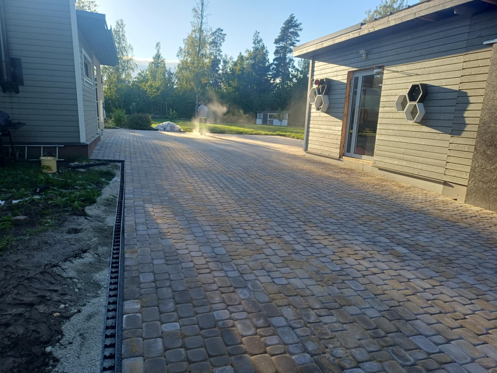 Paving installation price – or more broadly paving stone installation cost – depends on stone type (Nunna, Kloostrikivi, Munga, Kartano, Murukivi), colour and area, and whether edging is needed. Our price calculator gives you an indicative price – choose stone, edging and enter square and linear metres.